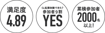 東京・大阪合わせて数千人(2回以上参加された方が2,000名以上)の起業家、起業志望者が参加しています。開催の都度、フィードバック内容や教え方などを試行錯誤しながら短時間で密度の高い講義にできるようブラッシュアップしてきました。